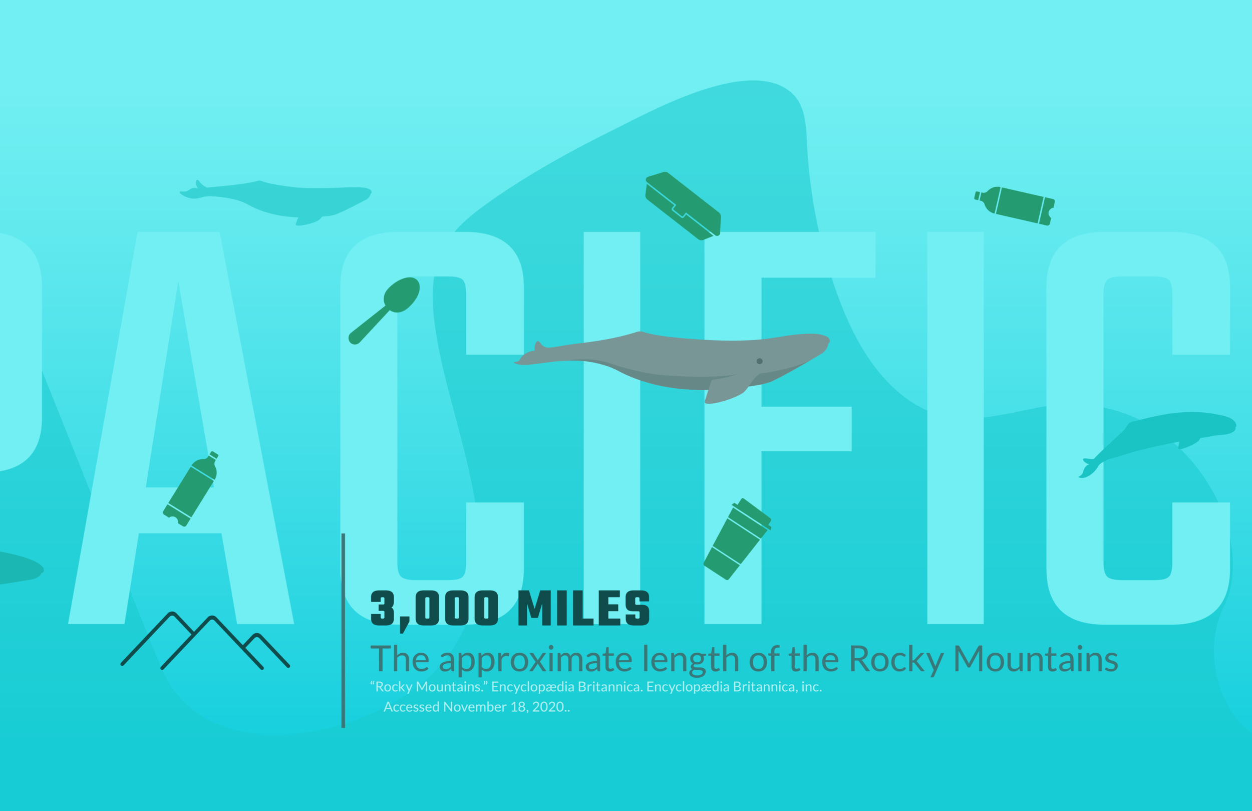 A Whale of a Journey is a horizontal scrolling website that engages the user by putting a numerical distance of migration miles into perspective with a comparison to other commonly understood distances. This map gives a visual representation of how far gray whales travel from their mating and birthing grounds to where they feed. The site utilizes calculated pixel measurements to accurately show the distance traveled in miles on a downsized scale. When scrolling, the ‘whale’ on the page is relatively fixed to the window, giving the impression that the viewer is swimming alongside the whale. The whale moves through a patch of motion graphic garbage that visually represents the Great Pacific Garbage Patch. The other two pages contain supplementary information about the geographic movement of gray whale migration and the Great Pacific Garbage Patch.